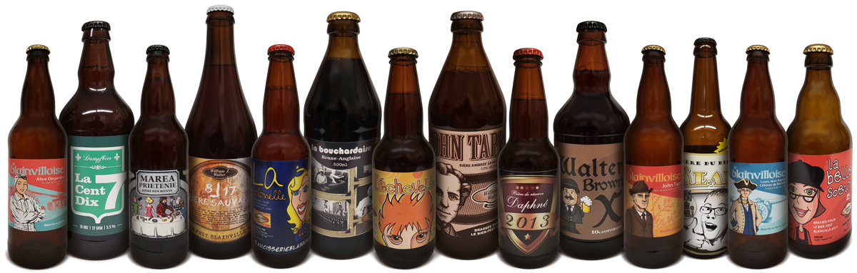 Depuis nos tout débuts, nous avons créés de nombreuses bières liées à l'histoire de Blainville et de la région. De gauche à droite : la Blainvilloise Aline Desjardins, La Cent Dix 7, Marea Prietenie, la 8/17, La Colonelle, La Bouchardaise, L'échevelée, la John Tapp, la Daphnée 2013, Walter Brown X, la Blainvilloise John Tapp, la Pâlale, la Blainvilloise Céloron de Blainville et La Belle-Soeur.